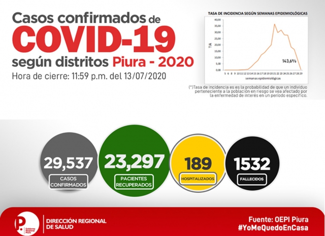 ERP. La Oficina de Epidemiología de la Dirección Regional de Salud de Piura, reportó que al 14 de julio del 2020; se tiene 29,537 casos confirmados de COVID-19, en tanto que desde el inicio de la pandemia los fallecidos suman 1532. Además la cantidad de hospitalizados sigue disminuyendo y actualmente se tiene 189 en esa condición, 23,927 fueron dados de alta tras superar la enfermedad.