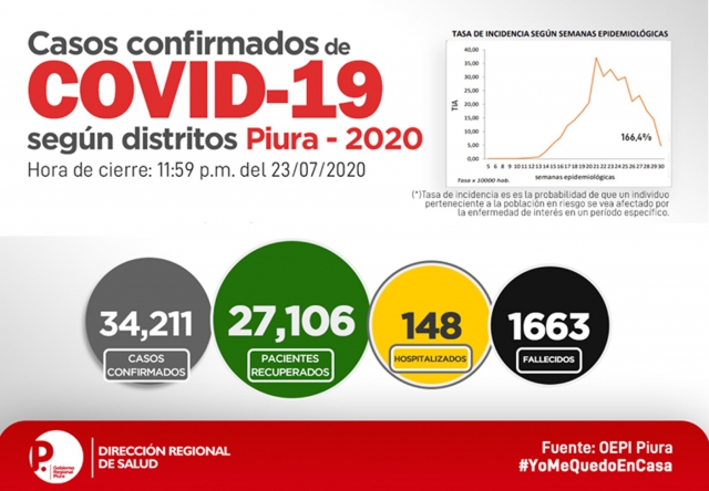 ERP. La Oficina de Epidemiología de la Dirección Regional de Salud de Piura, informó que a la fecha se registran 34,211 casos positivos de COVID-19; en tanto que los fallecidos totalizan 1,663. La información corresponde al 24 de julio con hora de corte a las 00 horas. De igual manera se ratifica que el distrito de Piura, sigue siendo el de mayor incidencia; seguido de Castilla y Sullana.