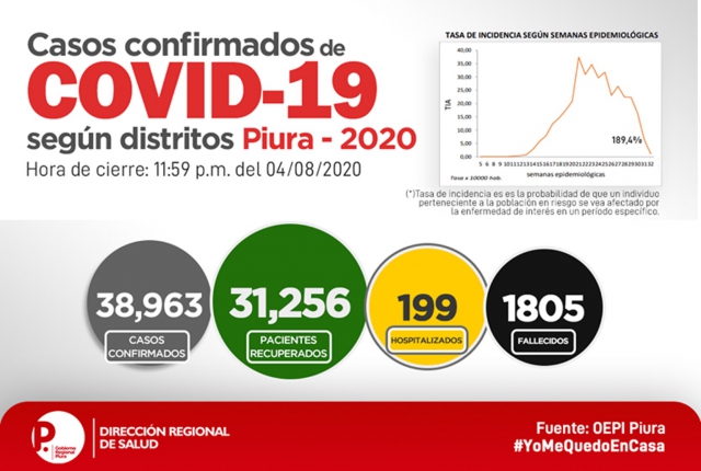 ERP. La Oficina de Epidemiología de la Dirección Regional de Salud, confirmó que al 5 de agosto, 00 horas, el reporte de contagiados por COVID-19 llegan a los 38,963; en tanto que los fallecidos suman 1,805. La tasa de letalidad, con los datos mencionados se mantiene en 4.6%.
