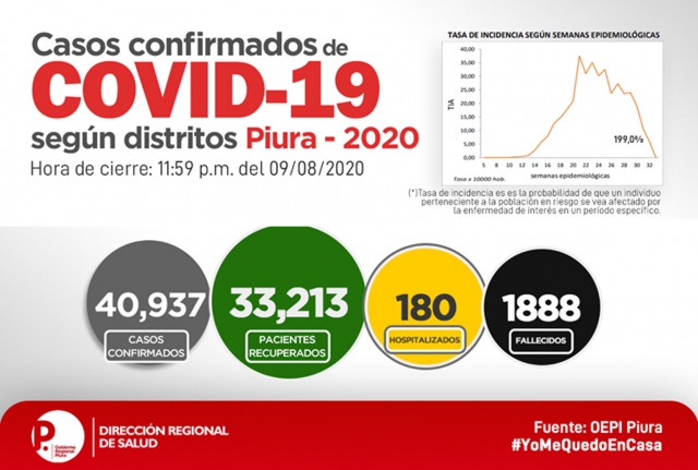 ERP. La Oficina de Epidemiología de la Dirección Regional de Salud de Piura, reportó al 10 de agosto del 2020 los casos confirmados de Covid-19 los cuales suman 40,937; en tanto que los fallecidos totalizan 1,888 desde el inicio de la pandemia. De acuerdo a la información sistematizada la tasa de letalidad se mantiene en 4,6%