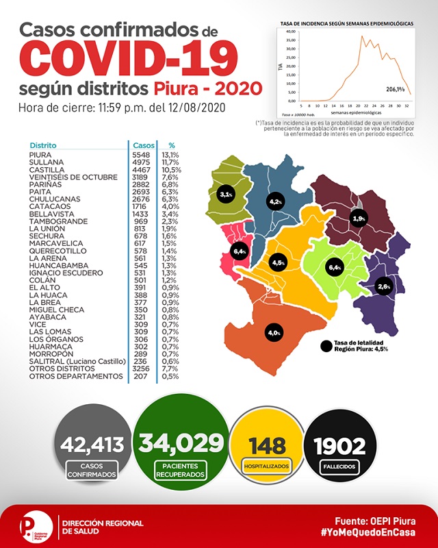 ERP. La Oficina de Epidemiología de la Dirección Regional de Salud de Piura, informó con retraso sobre la sala situacional de esta región, con datos que corresponden al 13 de agosto 00 horas, donde se precisa que a dicha fecha se tiene 42,413 casos confirmados de COVID-19, en tanto que los fallecidos son 1902, uno menos que el día previo, lo que indicaría que se hizo la corrección respectiva.