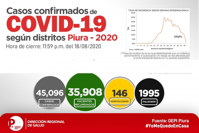 ERP. La Oficina de Epidemiología de la Dirección Regional de Salud de Piura, informó que la Sala Situacional del departamento registra 45,096 casos confirmados de COVID-19, en tanto que a la misma los fallecidos suman 1,996. La tasa de letalidad con la información existente es del 4.4%.