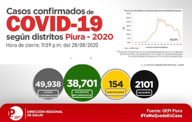 El día anterior y debido a la irregularidad de la Oficina de Epidemiología de la Diresa Piura no dio a conocer la Sala Situacional del día, la misma que fue publicada en la fecha y donde se precisa que los casos confirmados al 28 de agosto fueron 49,309; y, los fallecidos totalizaron 2,087 personas; asimismo, se indicó que 163 se encontraban hospitalizados.