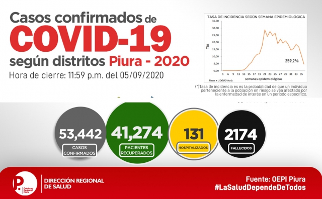 ERP. La Oficina de Epidemiología de la Dirección Regional de salud de Piura informó sobre la Sala Situacional de COVID-19, registrando al 6 de setiembre la cantidad de 53,442 casos confirmados, en tanto que hasta la fecha se tiene 2,174 fallecidos. Del total de casos se consideran 352 que son importados de otras regiones como Lima, Tumbes, Lambayeque, Cajamarca y otros.