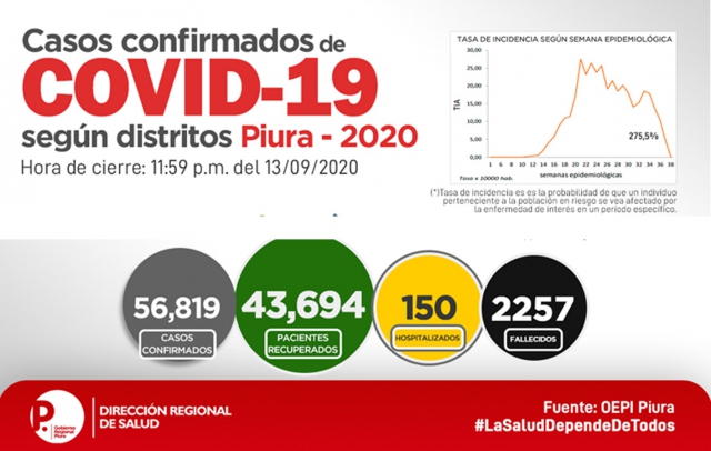 ERP. La Oficina de Epidemiología de la Dirección Regional de salud de Piura, informó que al 14 de septiembre se registran 56,819 casos confirmados de COVID-19, en tanto que los fallecidos por la enfermedad suman 2,257. Se mantiene el 4% de tasa de letalidad o muertes por la peligrosa pandemia.