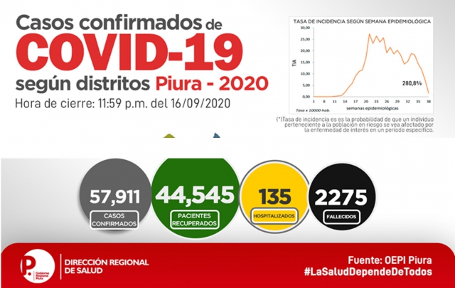 ERP. La Ofcina de Epidemiología de la Dirección Regional de Salud de Piura, registró que al 17 de septiembre del 2020, a las 00 horas, se tiene 57,911 casos confirmados de Covid-19, en tanto que los fallecidos por la enfermedad subieron a 2,275. La tasa de letalidad se mantiene en 3,93% un descenso lento pero que sigue costando vidas a muchos piuranos.