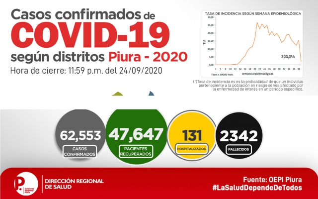De acuerdo a lo informado por la OEPI- Piura, los casos corresponden al 25 de septiembre, hora de corte 00 horas. La mayor cantidad de casos confirmados se encuentran en la provincia de Piura, la cual registra 27,154; la provincia de Sullana tiene a la fecha 11,455 casos, Talara, 8,551; Paita, 6,187; de igual manera se reportan 447 casos importados de otras regiones como Tumbes, Lambayeque, La Libertad, Cajamarca, Lima, entre otras.