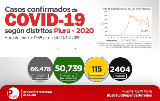 ERP. La Oficina de Epidemiología de la Dirección Regional de Salud de Piura, la región registra 66,478 casos confirmados de COVID-19; en tanto que los fallecidos por dicha enfermedad suman 2,404 personas. La tasa de letalidad considerando los datos existentes es de 3,62%.