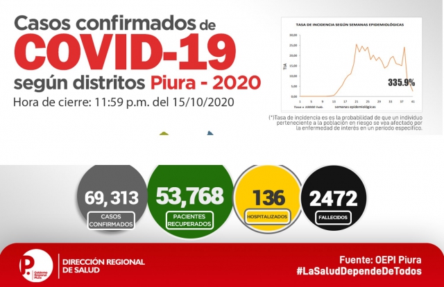 ERP. Según la Oficina de Epidemiología de la Dirección Regional de salud, al 16 de octubre del 2020, la Región Piura registra 69,313 casos confirmados de Covid-19 y 2,472 fallecidos por la indicada enfermedad. De acuerdo a la información oficial, del total 529 son importados de otras regiones como Tumbes, Lambayeque, La libertad, Lima, entre otras; igualmente, la tasa de letalidad es del 3.57%.