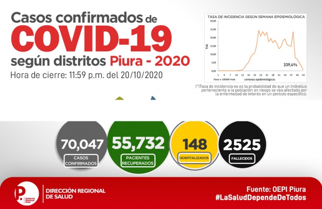 ERP.. La región Piura superó los 70 mil casos confirmados de COVID-19, lo que demuestra que el indicado virus aún no ha sido controlado. al 21 de octubre los la cifra llega a los 70,047 positivos, en tanto que los fallecidos por la enfermedad son 2,525. Si bien es cierto que el crecimiento es menor a lo observado en meses anteriores, aún se tiene una tasa de letalidad de 3.57% ligeramente inferior al día previo.