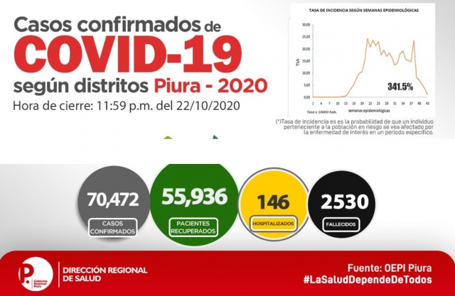 ERP. La Oficina de Epidemiología de la Dirección Regional de Salud de Piura, reportó que al 23 de octubre del 2020, los casos confirmados de COVID-19 llegan a 70,472, en tanto que los fallecidos totalizan a la fecha 2,530 personas. La tasa de letalidad se mantiene en 3.59%, en tanto que la de incidencia es del 341.5%.