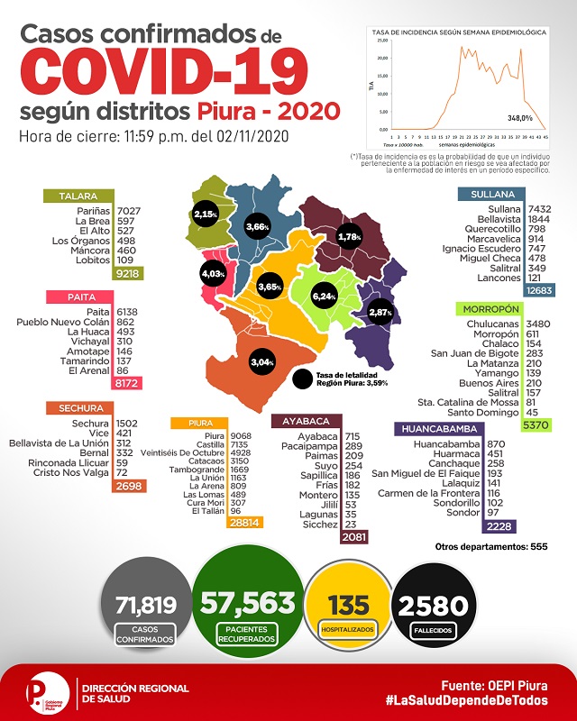 ERP. La Oficina de Epidemiología de la Dirección Regional de Salud de Piura informó que de acuerdo a la Sala Situacional correspondiente al 3 de noviembre registra 71,819 casos confirmados de Covid-19 y 2,580 fallecidos por causa de la enfermedad. La tasa de letalidad se siguen manteniendo en los mismos valores del día anterior, es decir del 3,59%.