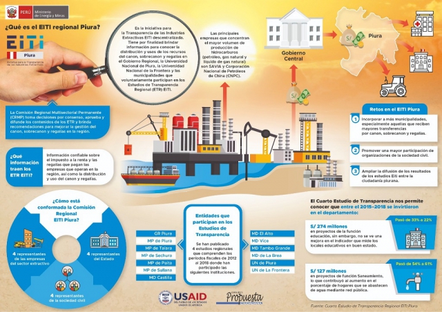 ERP. La Comisión Regional EITI Piura, presentó el pasado 02 de diciembre, a través de un foro virtual, los resultados del Cuarto Estudio de Transparencia Regional EITI Piura, correspondientes al periodo 2015-2018, dichos estudios brindan información confiable sobre el impuesto a la renta y regalías que pagan las empresas que operan en la región, así como la distribución y uso de estos recursos que realizan las Entidades EITI (entidades públicas que participan brindando información en el estudio).