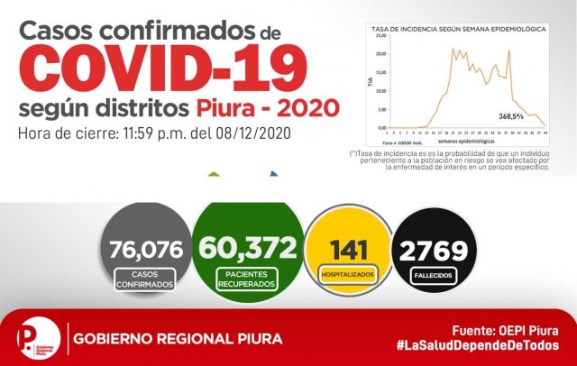 ERP., La Oficina de Epidemiología de la Dirección Regional de Salud de Piura, informó que al 9 de diciembre a las 00 horas los casos registrados de Covid-19 llegan a 76,076; en tanto que los fallecidos llegan a 2,769. De acuerdo al último informe la tasa de letalidad es de 3.64 uno de los más altos del país.