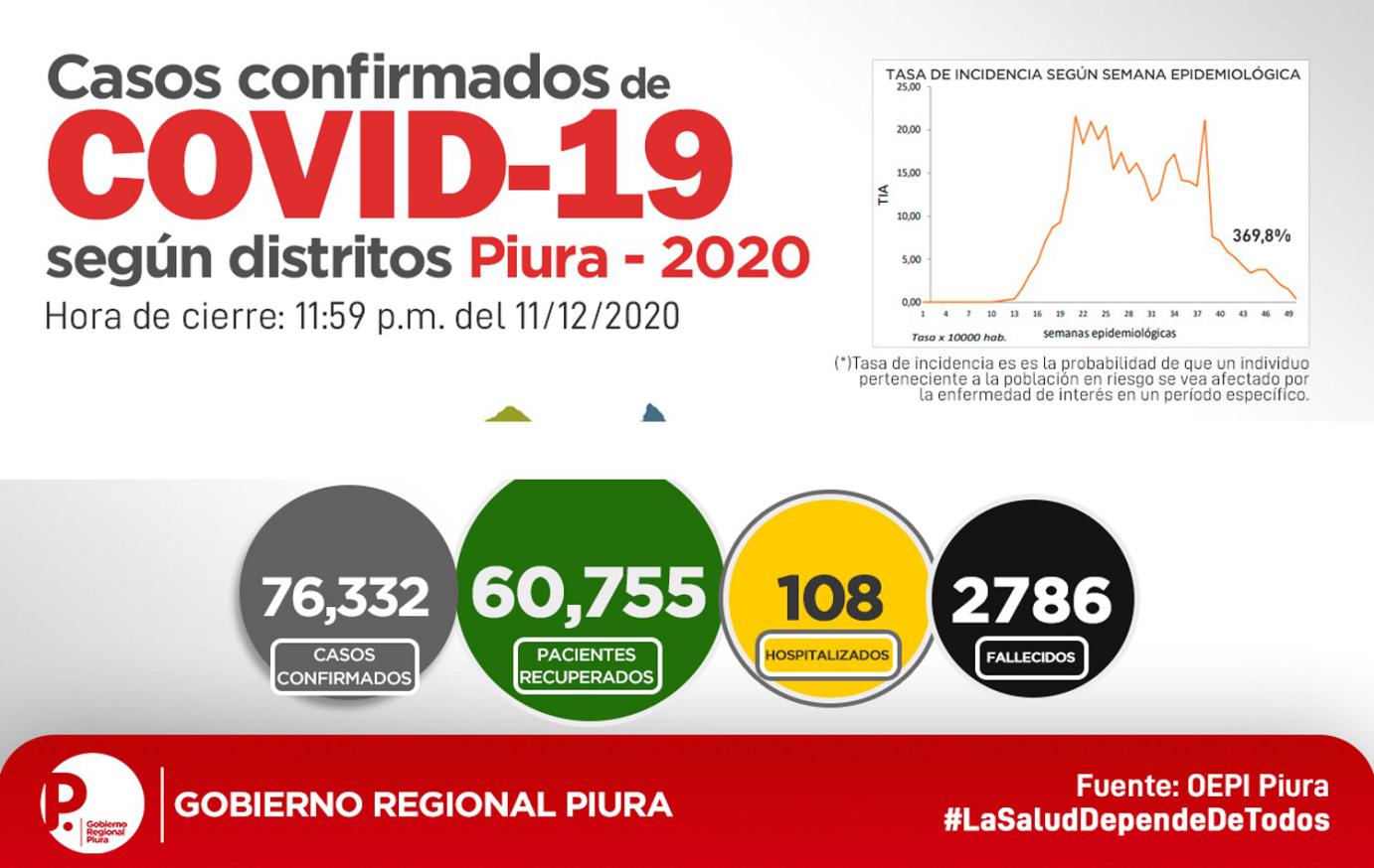 ERP. La Oficina de Epidemiología de la Dirección Regional de Salud de Piura informó que al 12 de noviembre 00 horas los casos confirmados de Covid-19-en la region son 76,332 en tanto que los fallecidos por la enfermedad suman 2,786, es decir 9 más en relación al reporte anterior. Con estas defunciones, la situación sube a 3.65% un porcentaje elevado en relación a otros departamentos.