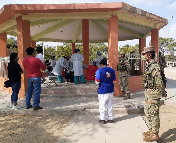 Durante la supervisión también se constató que los puntos de vacunación estaban debidamente resguardados por personal de las Fuerzas Armadas, quienes brindaban seguridad y apoyo para garantizar el distanciamiento social y controlar el orden.