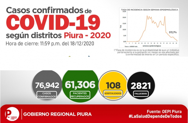 ERP. La Región Piura registra 76,942 casos confirmados de Covid-19 y 2,821 fallecidos al 19 de diciembre del 2020. De acuerdo a la Oficina de Epidemiología de la Dirección Regional de Salud de Piura, la tasa de letalidad se encuentra en 3.67% similar al día previo. Tal y conforme hemos dado cuenta en otras informaciones las muertos por la enfermedad no se detienen y amerita mayor prevención.