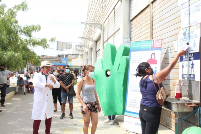 “El equipo de promoción de la salud y comunicación han acudido hoy al Mercado Modelo de Piura, terminal terrestre de Castilla y Centro Comercial Open Plaza para trasmitir mensajes preventivos sobre: correcto lavado de manos con agua y jabón (por un mínimo de 20 segundos), uso adecuado de mascarilla (nariz y boca) y distanciamiento social (más de 1 metro)” dijo Arévalo.