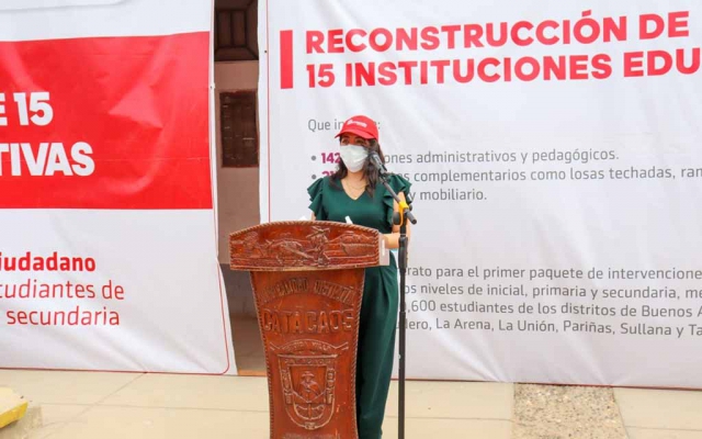 Hasta la localidad de Catacaos llegó la directora ejecutiva de la ARCC, Amalia Moreno Vizcardo, para iniciar a los trabajos de reconstrucción de la I.E José Cayetano Heredia, con un financiamiento de S/ 21 569 979.80 y que beneficiará a 1279 estudiantes. Con la puesta de primera piedra en este local educativo, en simultáneo empezarán los trabajos en otros 14 colegios, con una inversión de S/194 466 892.65.