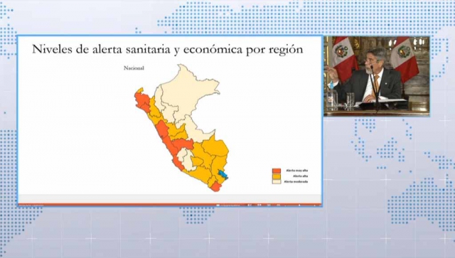 Nivel de alerta alto: Tumbes, Cajamarca, La Libertad, Huánuco, Pasco, Cusco, Apurímac, Arequipa, Madre de Dios, Puno, Moquegua y Lima Metropolitana con toque de queda de 9pm a 4am.