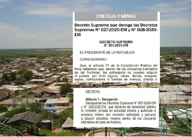 Asimismo, se indica en el Decreto Supremo que deroga las cuestionadas autorizaciones para que puedan operar en zona de frontera, due, la información complementaria y actualizada sobre la situación económica-social en el distrito de Tambo Grande ubicado en el departamento de Piura hace necesaria, en el marco de lo establecido en el artículo 71 de la Constitución Política del Perú, la reevaluación de la necesidad pública que sustentó la emisión de los Decretos Supremos N° 027-2020-EM y N° 028-2020-EM.