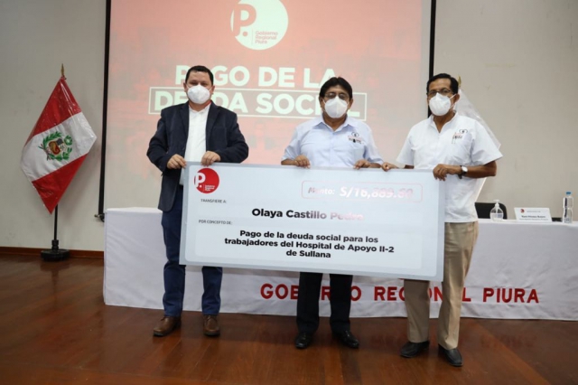 ERP. El gobernador regional de Piura, Servando García Correa, hizo la entrega simbólica de cheques por más a 8 millones de soles por concepto del pago de la deuda social a pensionistas y trabajadores activos de la Sede Central, Gerencia Sub Regional Morropón Huancabamba, Proyecto Especial Chira Piura (Pechp) y el sector Salud, que contempla a 1232 beneficiarios.