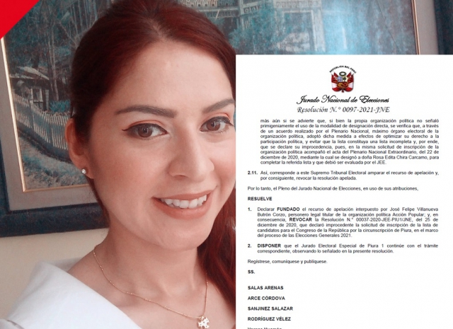 De esta manera, no solo se valida la participación de Acción Popular en el departamento de Piura, sino al mismo tiempo se considera v+alida la participación de Rosa Edita Chira Cárcamo, que ingresó en reemplazo de Versany Santur.