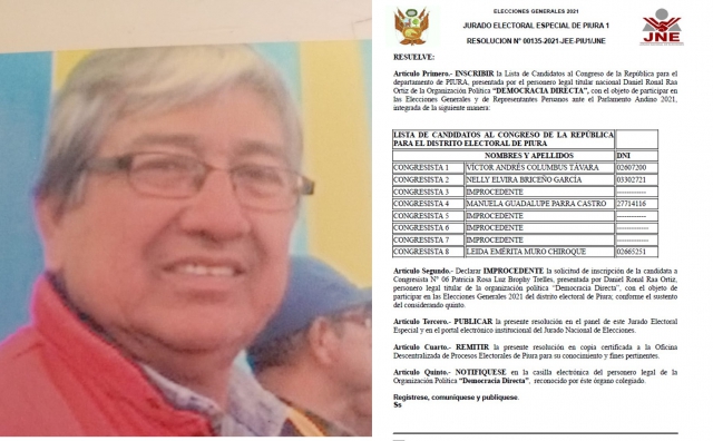ERP. El Jurado Electoral Especial de Piura I, procedió a inscribir la lista congresal por el departamento de Piura de la organización política Democracia Directa. En una primera instancia fue declarada improcedente y el Jurado Nacional de Elecciones se pronunció de acuerdo a sus atribuciones declarando fundado el recurso de apelación. La lista es liderada por Víctor Andrés Columbus Távara.