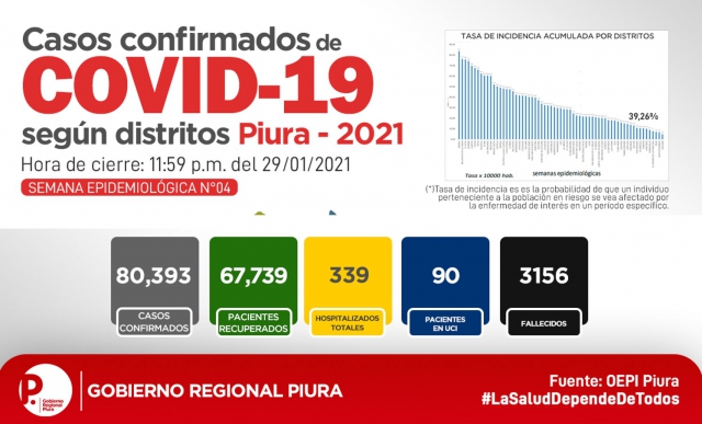 ERP.. Aunque la calificación otorgada para Piura en la pandemia es diferente; los casos de Covid-19 sigue siendo crítica conforme se observa en el informe de la Oficina de Epidemiología de la Dirección Regional de Salud de Piura. De acuerdo al reporte correspondiente al 30 de enero, se tiene 80,393 contagiados, en tanto que perdieron la vida un total de 3,156 personas. La tasa de letalidad sigue creciendo y ya se encuentra en 3,93%.