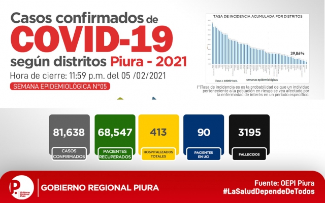 ERP. La Oficina de Epidemiología de la Dirección Regional de Salud de Piura, informó que al 6 de febrero del 2020, los casos de Covid-19-Piura suman 81,638, en tanto que las personas que fallecieron por la enfermedad son 3,195. La tasa de letalidad es del 3,91% el cual se mantiene alto por la mayor recurrencia de contagios y que no se pueden salvar.