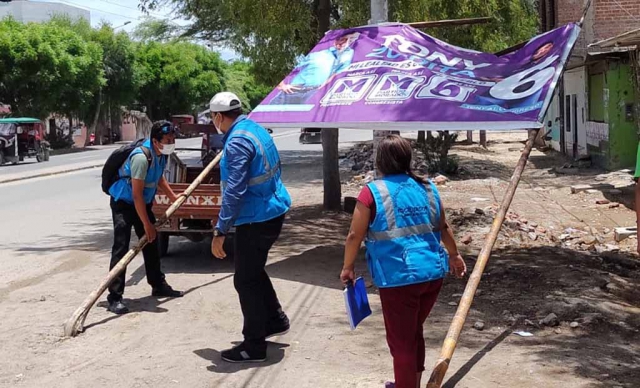 ERP. Con la finalidad de regular la propaganda electoral en el distrito de Castilla, la oficina de Fiscalización, identificó y ubicó los anuncios políticos puestos en las diferentes calles y avenidas consideradas prohibidas, a fin de mantener el ornato y velar por buen desarrollo de los comicios electorales.