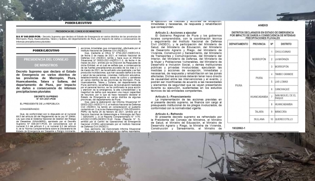 En la provincia de Morropón, el estado de emergencia regirá en Chulucanas (capital) y en los distritos de La Matanza y Morropón; en Piura, en Tambo Grande y Las Lomas; en Huancabamba, en Canchaque, San Miguel de El Faique y Huancabamba; en Talara, en Máncora; y en Sullana, en Querecotillo.