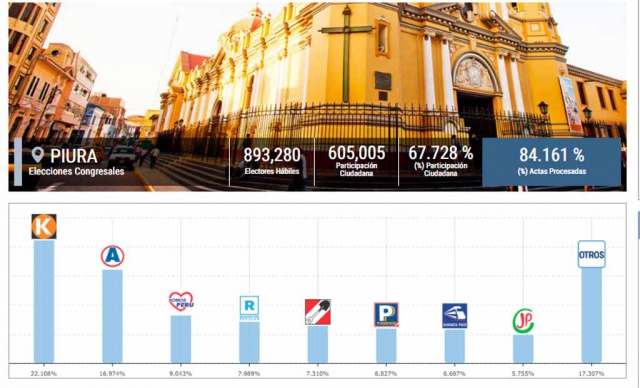 El partido político Acción Popular lucha voto a voto uno de los cupos que le corresponden a Piura. De acuerdo a la información de la Oficina Nacional de Procesos Electorales, la diferencia entre el tercer candidato de Fuerza Popular es mínimo en relación a lo obtenido por el partido de la Lampa. De mantenerse hasta el 100% podría elegirse a Olibia Pulache Jiménez o Maritza Gil Ordinola.