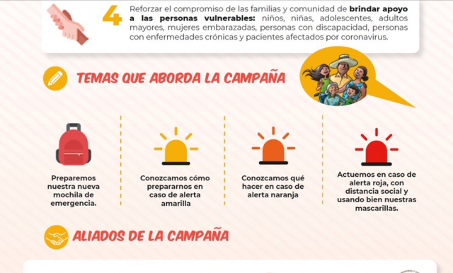 La campaña “Juntos reducimos riesgos y prevenimos desastres” brindará información en cuatro ejes temáticos, centrados en dar a conocer cómo preparar la mochila de emergencia en el contexto de la Covid 19; así como las medidas a tomar al activarse el sistema de alerta temprana en caso de alerta amarilla, naranja y roja.