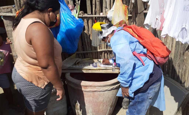 “Esta actividad permite identificar y eliminar las larvas del zancudo. Nuestros inspectores dan orientación sobre lavar, escobillar y tapar los depósitos donde se almacena el agua y aplican a los recipientes el insumo para eliminar las larvas del zancudo”, señaló Valdiviezo Negreiros.