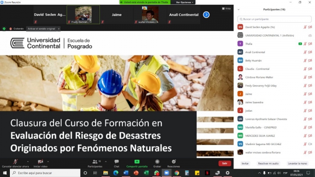 Hoy esta mañana, autoridades y funcionarios involucrados del proyecto participaron de una breve ceremonia virtual de clausura, donde los participantes resaltaron la importancia de invertir en el “talento humano” para la gestión de riesgos de desastres, proceso que señalaron, no sólo quedará como una capacitación, sino que serán acreditados por Cenepred para ser “Evaluadores de riesgo”, compromiso y responsabilidad que tendrán con la región Piura.