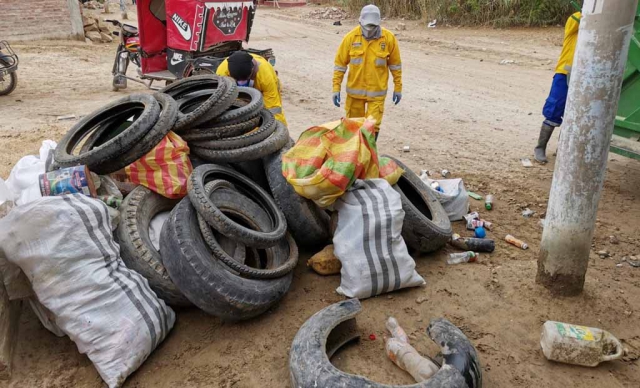 En la actividad, iniciada desde las 8 de la mañana, se recogieron más de 5 toneladas de objetos en desuso que se encontraban abandonados en los patios y techos de las viviendas, tales como baldes, llantas, botellas, tinas y otros.