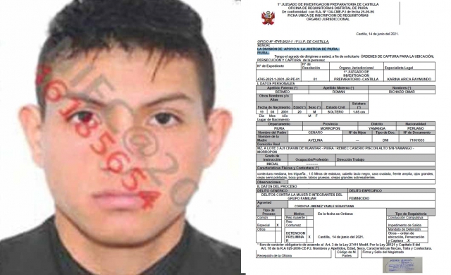 Con la finalidad de cumplir lo dispuesto por el 1° Juzgado de Investigación Preparatorio del distrito de Castilla, se ha cursado el oficio para que la División de Apoyo a la Justicia de Piura, proceda con el mandato de ubicación, persecución y captura de Bermeo Román, quien sería factible de una pena mínima de 20 años de cárcel o más.