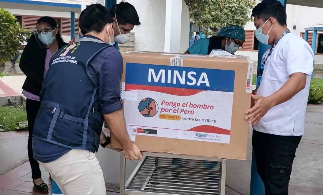 Las dosis de la vacuna llegaron a las 10:20 de la mañana al Aeropuerto Internacional Capitán FAP Guillermo Concha Ibérico, a través de un vuelo solidario y estuvo supervisado por el personal de Centro Nacional de Abastecimiento de Recursos Estratégicos en Salud (CENARES) del Minsa.
