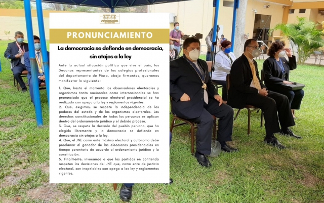 ERP. Los decanos de diversos colegios profesionales de Piura, se pronunciaron por la pronta proclamación del candidato ganador de las últimas elecciones generales y que para diversos entes se ha realizado con total normalidad. Con la frase, "La democracia se defiende en democracia, sin atajos a la ley" exigen se respete la independencia de poderes del Estado y de los organismos electorales.
