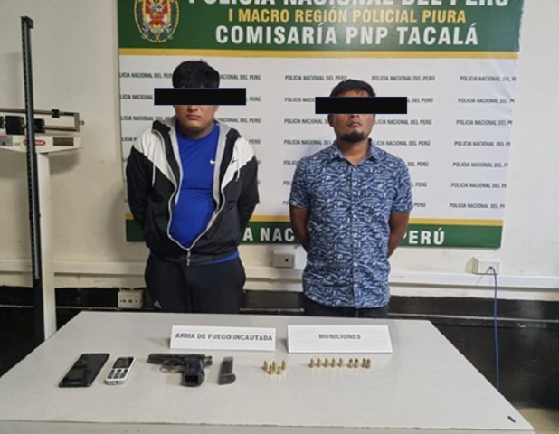 ERP. Efectivos de la Policía Nacional del Perú, de la jurisdicción correspondiente a la Comisaría de Tacalá, en el distrito de Castilla, Piura, procedieron a intervenir a dos personas quienes al realizar el respectivo registro se les encontró un arma de fuego. Se trata de Jhon Frank Inga Yovera (25) y José Aquino Imán Aquino (23), quienes son acusados del presunto delito contra la seguridad pública.