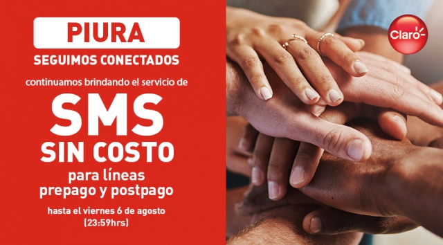 ERP. Solidarizados con los damnificados de la región Piura tras el sismo ocurrido el pasado viernes 30 de julio con epicentro en la ciudad de Sullana, Claro continuará brindando el servicio de mensajes de texto (SMS) sin costo para todos sus clientes de líneas móviles prepago y postpago que se encuentren en la zona afectada del norte del país.