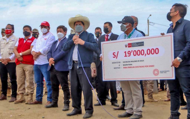 ERP. El presidente de la República, Pedro Castillo Terrones, anunció hoy que el Gobierno destinó 19 millones de soles para atender a los damnificados del reciente sismos ocurrido en la región de Piura.