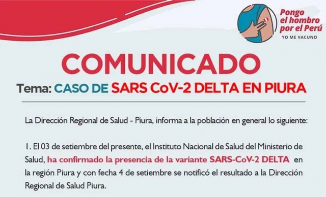 ERP. Razones de preocupación para las autoridades de la Dirección Regional de Salud de Piura y la población misma que se encuentra expuesta a la Covid-19. De acuerdo al Instituto Nacional de Salud del Ministerio de Salud se ha confirmado la presencia de la variante SARS-Cov-2 Delta, en la región Piura, la misma que es más agresiva y genera una mayor velocidad de contagios.