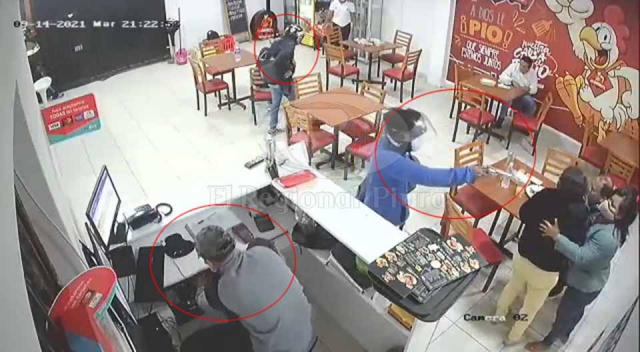 Las video cámaras del local grabaron el preciso instante como los sujetos ingresaron amenazando con armas de fuego a las personas que se encontraban en el lugar arrebatándole las pertenencias y uno de ellos se dirigió a la caja chica llevándose todo el dinero producto de la venta del día.