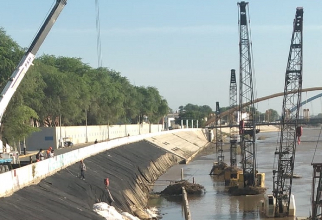 Los diferentes frentes de trabajo que se ejecutan corresponden a conformación de dique, vaciado de losas de concreto que se hace en horario nocturno. También se vienen construyendo paralelamente los parapetos. Hasta el momento el hincado de tablestacas y relleno de taludes están al 100 por ciento y la ejecución de vigas al 90 por ciento.