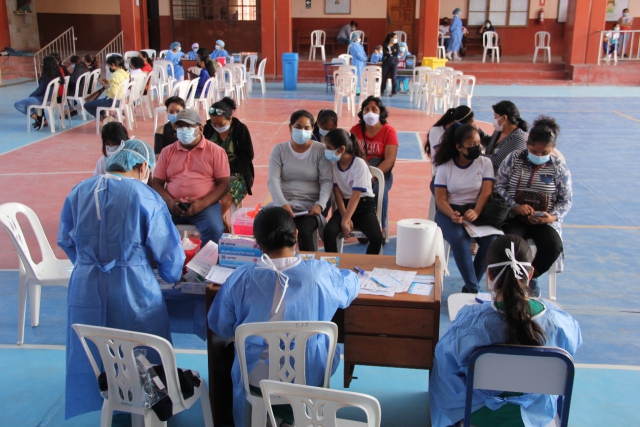 Desde las 8 de la mañana, los estudiantes de la I.E. San José de Tarbes y Nuestra Señora del Tránsito acudieron en forma ordenada y acompañados por sus padres a recibir su primera dosis de la vacuna, en los horarios establecidos en la convocatoria realizada por los directivos de cada casa de estudios.