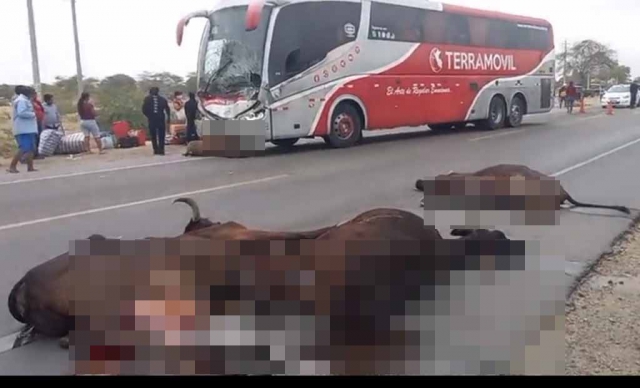 ERP. La excesiva velocidad de un ómnibus de la empresa Terra Móvil, sería la causa de la colisión y atropello de 11 reses en el centro poblado Jesús de Nazaret, distrito de Cura Mori, provincia de Piura, en la vía Panamericana. La propietaria identificada como Martha Morales Castillo, dio a conocer el hecho e indicó que el ganado tenía un valor individual de 3,500 soles.