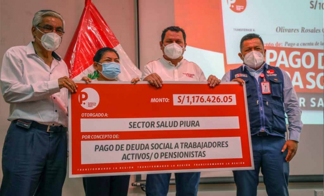 ERP. Esta mañana el gobernador, Servando García entregó cheques por concepto del pago de deuda social a favor de pensionistas y trabajadores activos de las diversas unidades ejecutoras del sector salud. La entrega tuvo lugar en el auditorio del Gobierno Regional, Luis Paredes Maceda.