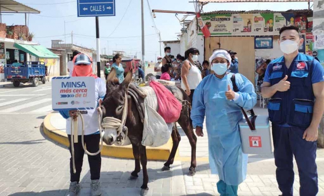 El simpático burrito acompañó a su dueña, la señora Juana Iris Saucedo Vite, una comerciante que recorre el sector noreste de la ciudad vendiendo y concientizando a la población de la importancia de la vacuna para estar protegidos frente al virus. Ella no dudó a sumarse a la jornada de prevención junto al personal y posó con su compañero de trabajo para “decirle a los piuranos que no le teman a la vacuna”.
